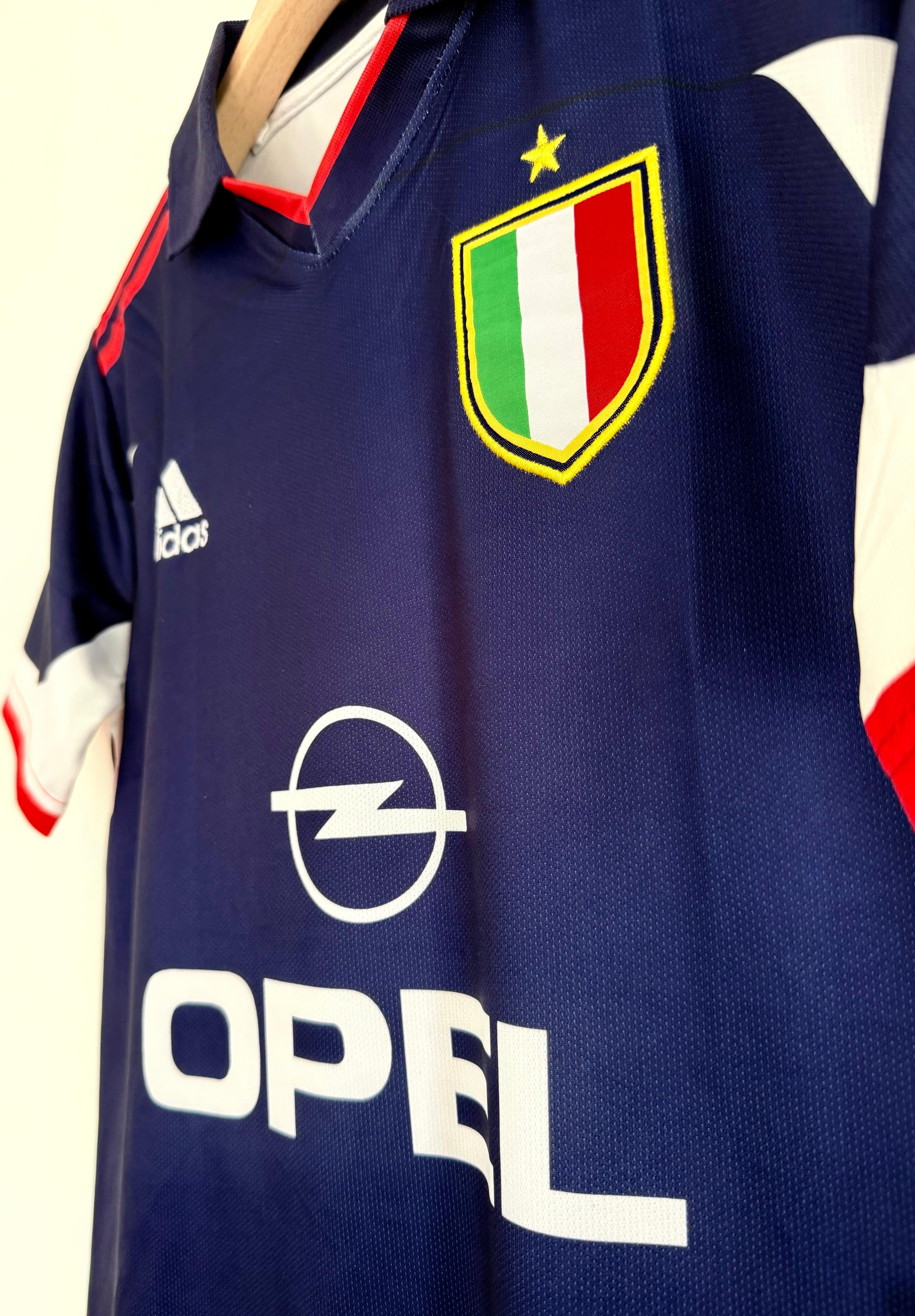The 1999/2000 third kit features a charcoal-grey base enriched with deep red piping and subtle black undertones, reflecting Milan’s signature colors with modern refinement. The embroidered AC Milan crest and Adidas logo add heritage authenticity, while the Opel sponsor sits prominently across the chest — completing the unmistakable 1990s look. A fold-over V-neck collar and minimal sleeve trim provide a clean, classic silhouette reminiscent of Milan’s European dominance.