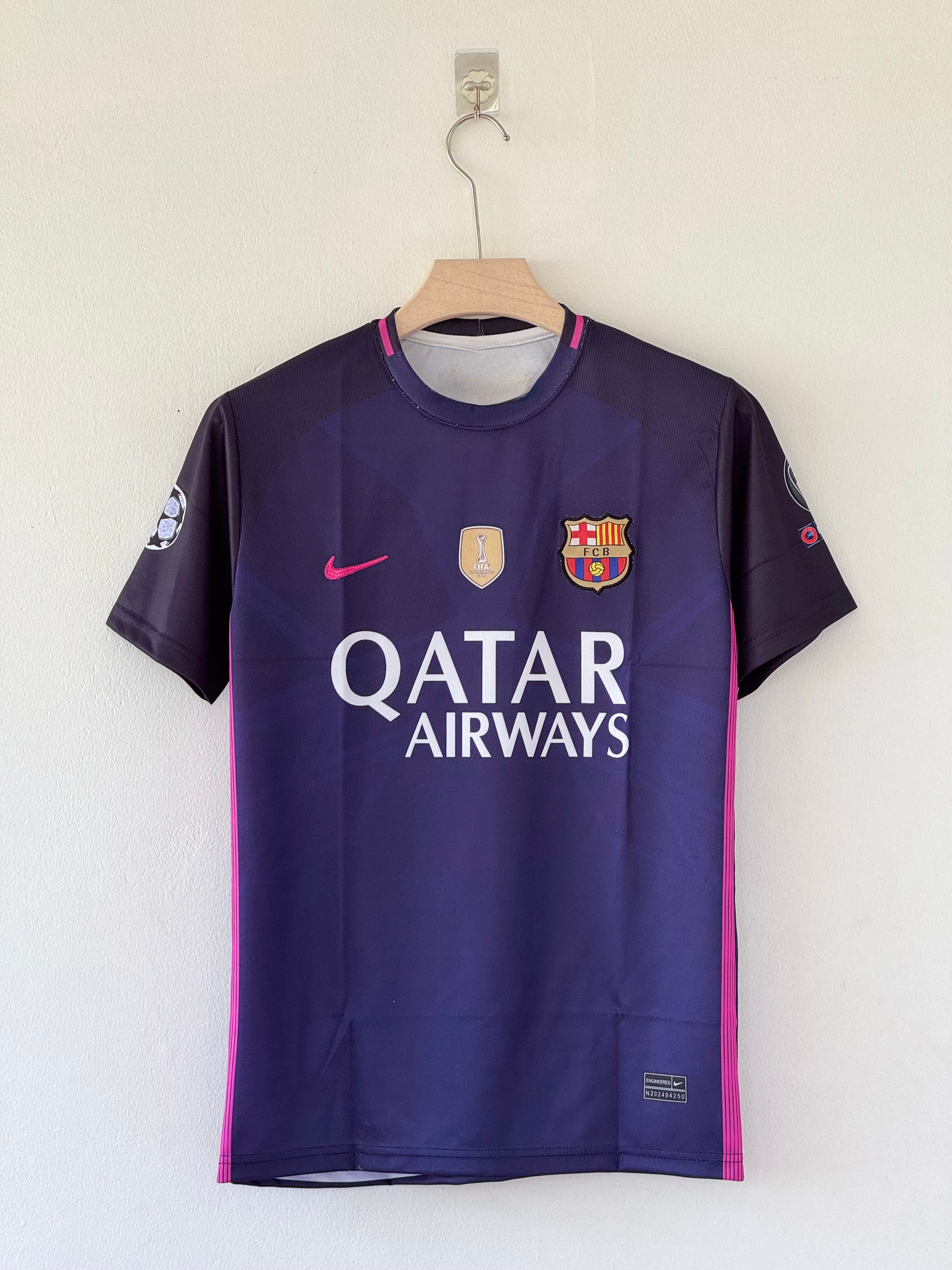 The 2016/17 away jersey stands out with its vibrant purple base and electric pink detailing on the sleeves and trims, symbolizing energy and creativity. The embroidered FC Barcelona crest sits proudly over the heart, balanced by the Nike swoosh and Qatar Airways sponsor across the chest. On the back, Messi’s name and legendary number 10 are printed in official La Liga style.