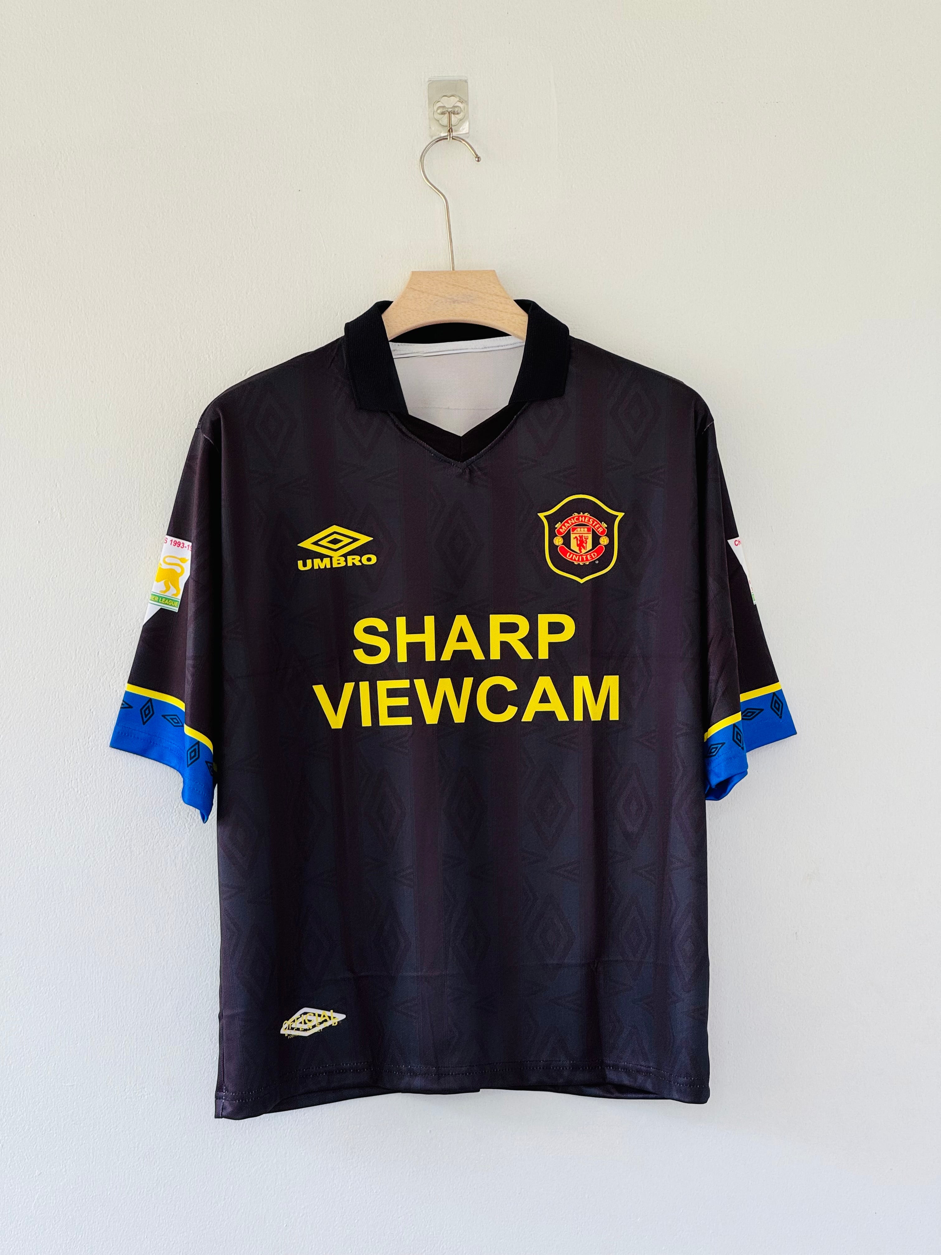 The original 1993/95 home jersey is remembered for its deep red base, black button-up collar with white trim, and the iconic Sharp sponsor emblazoned across the chest. The Umbro logo and Manchester United crest sit proudly on the front, symbolizing the beginning of a dynasty that would dominate English football.
