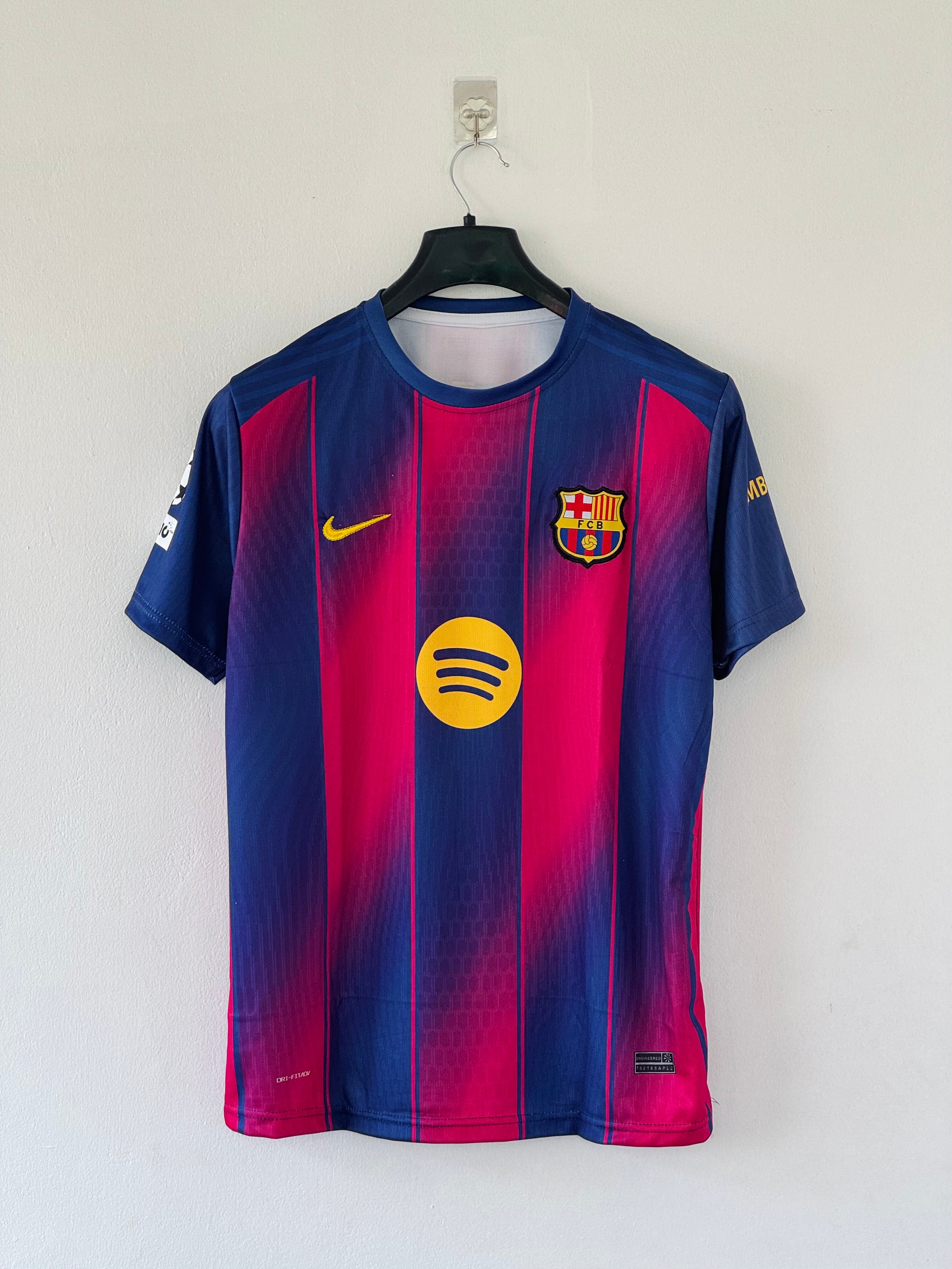 The 2025–26 home kit returns to bold Blaugrana stripes with a modern brush-stroke fade, giving a fresh twist to Barcelona’s iconic look. The Spotify sponsor sits prominently on the chest, flanked by the Nike swoosh and the FC Barcelona crest — both embroidered for a premium finish.