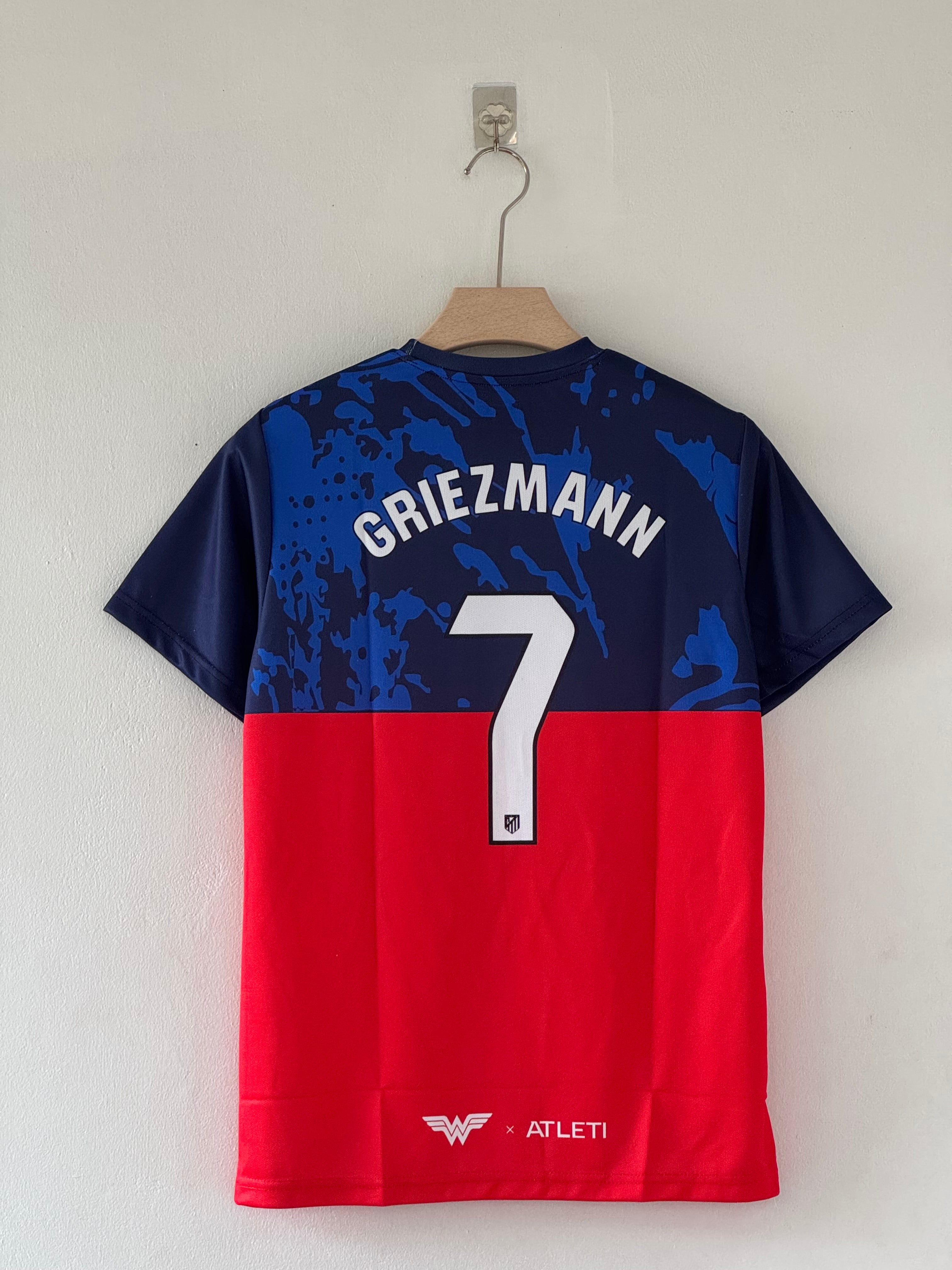 The Wonder Woman Edition transforms Atlético’s classic design into a deep crimson base with gold and royal blue accents, mirroring the legendary Amazonian armor. A gold chest emblem inspired by Wonder Woman’s “W” merges seamlessly with the Atlético crest, symbolizing strength and unity. The Nike logo shines in metallic gold, while the inner collar features the inscription “Força e Glória” (“Strength and Glory”) — a tribute to the spirit of both Wonder Woman and Atlético Madrid.