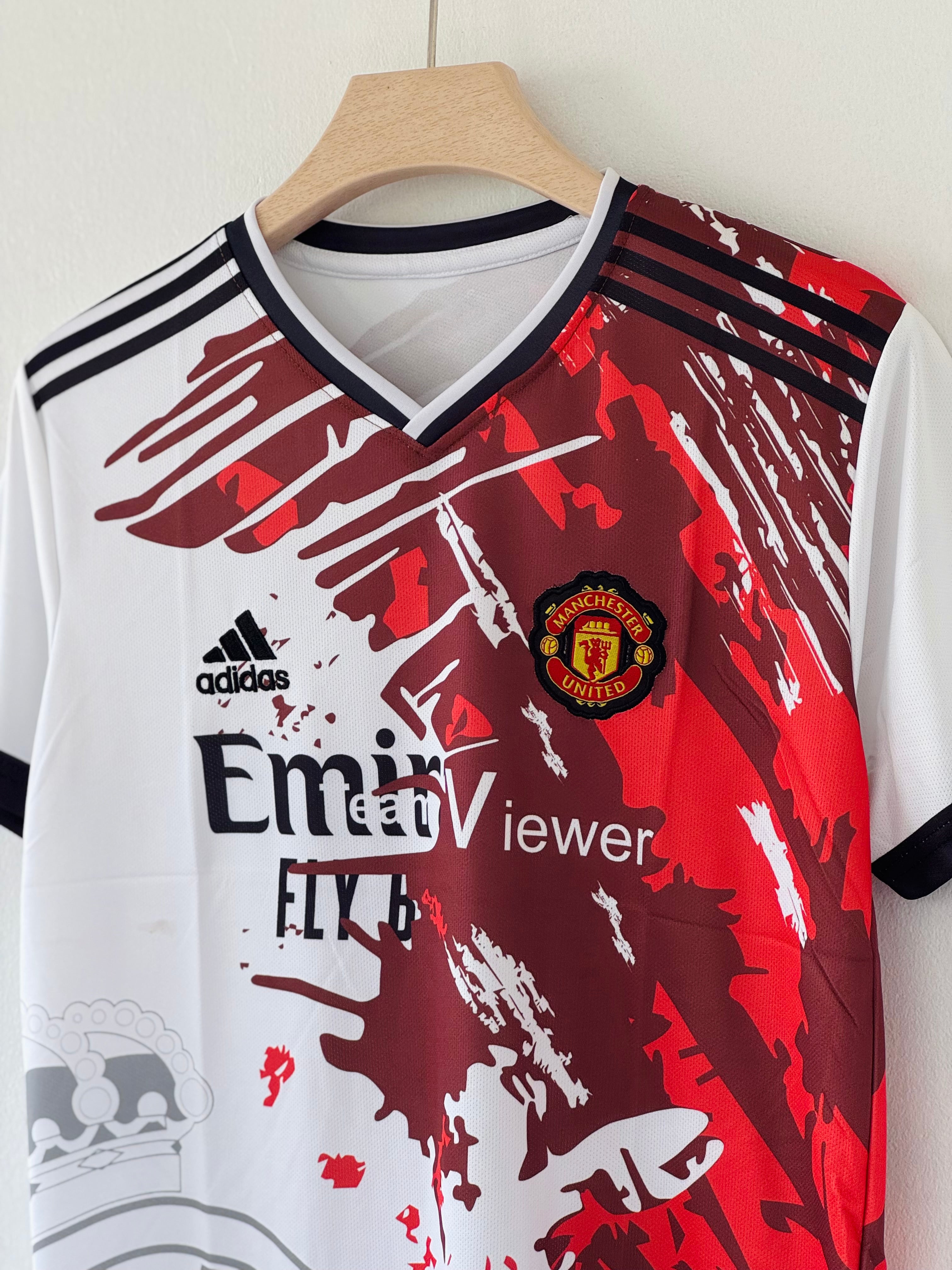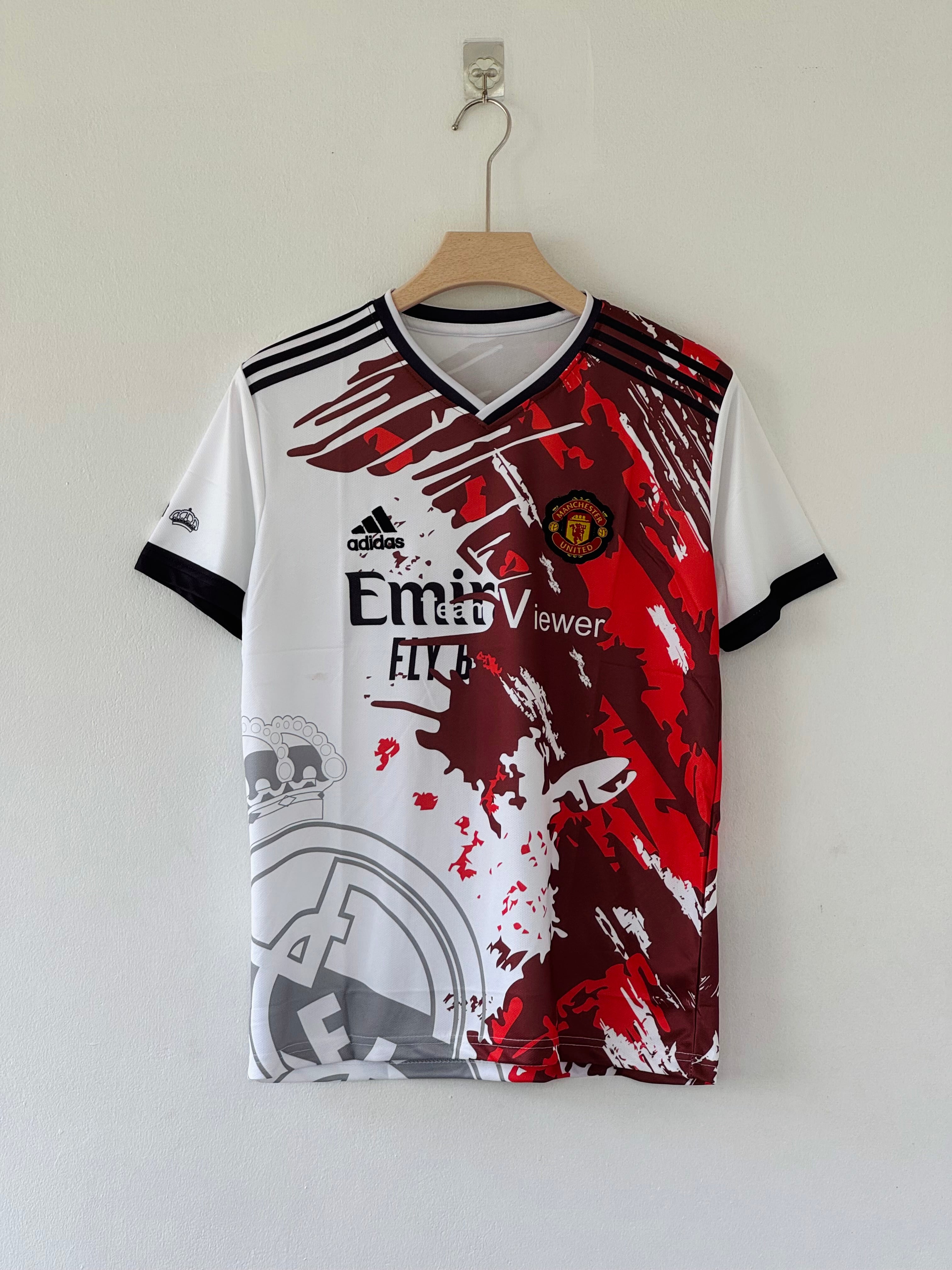 This split-design jersey blends the deep red of Manchester United with the classic white of Real Madrid, divided diagonally down the middle with a sharp contrast fade. The right chest features the Manchester United crest embroidered  to symbolize Ronaldo’s championship pedigree.